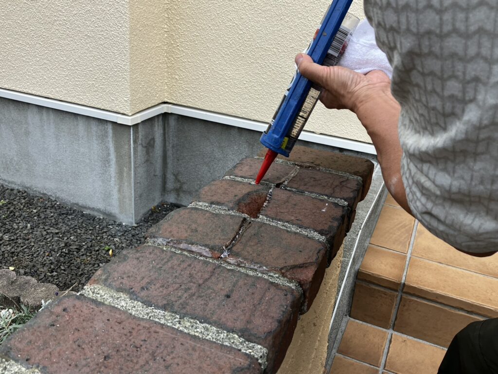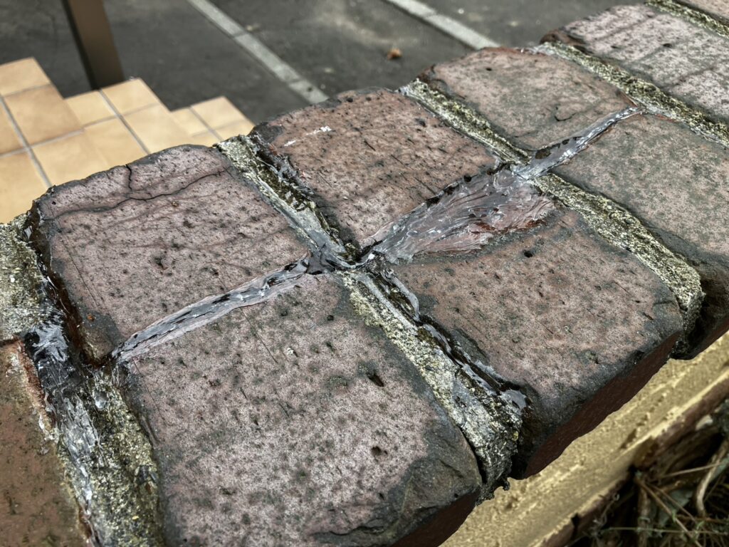 塀の上にあるレンガの部分で、ヒビから中に水が入っていきそうな箇所にコーキングを打って作業完了です!